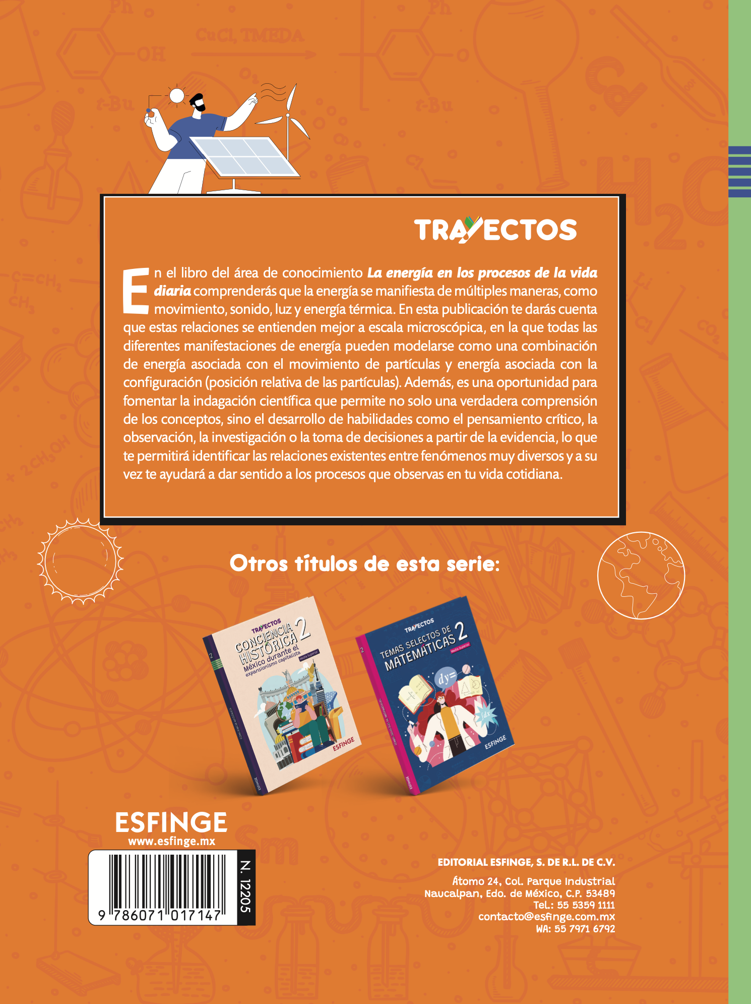 En el libro del área de conocimiento La energía en los procesos de la vida diaria, el alumnado comprenderá que la energía se manifiesta de múltiples maneras, como movimiento, sonido, luz y energía térmica. Se comprenderá que las relaciones se entienden mejor a escala microscópica, en la que todas las diferentes manifestaciones de energía pueden modelarse como una combinación de energía asociada con el movimiento de partículas y energía asociadas con la configuración. Se promueve la indagación científica que permite el desarrollo de habilidades como pensamiento crítico, observación, investigación o toma de decisiones.