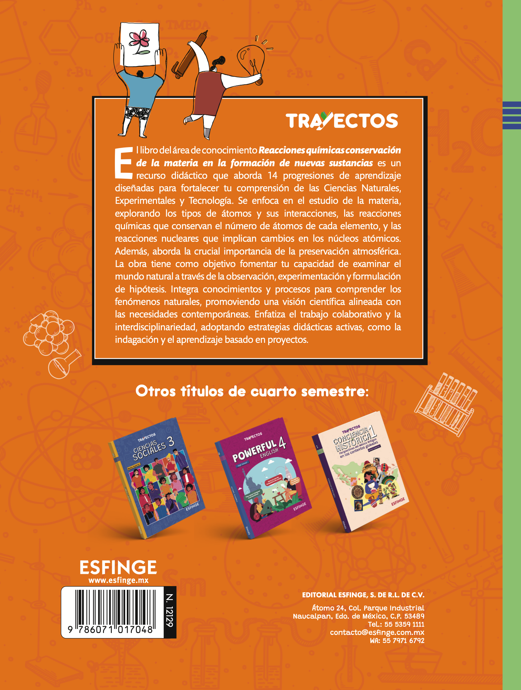 Reacciones químicas Conservación de la materia en la formación de nuevas sustancias es un libro que permite a los alumnos apropiarse de saberes, habilidades, conocimientos y nociones disciplinares con el objetivo de que impacten sus experiencias personales y colectivas, presentes y futuras. Ayuda a estudiar la estructura atómica, las transformaciones químicas que mantienen la conservación de la materia y la energía, las reacciones nucleares y el impacto de estos fenómenos en la preservación atmosférica. En este libro se orienta el aprendizaje hacia una visión más científica y coherente con las necesidades actuales, tanto científicas como tecnológicas.