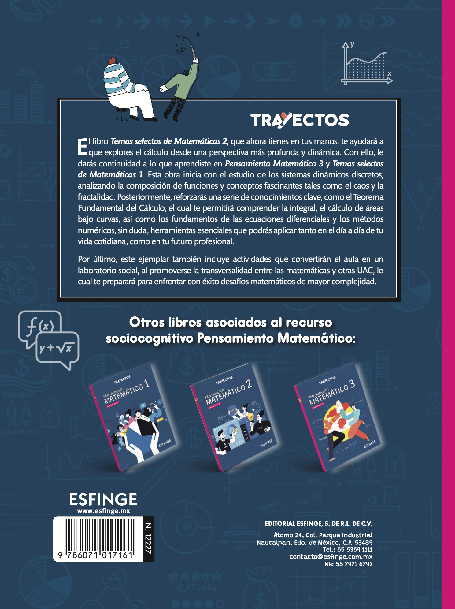 El libro Temas Selectos de Matemáticas 2 permite al alumnado explorar el cálculo desde una perspectiva más profunda y dinámica. Esta obra inicia con el estudio de los sistemas dinámicos discretos, analizando la composición de funciones y conceptos tales como el caos y la fractalidad. Se refuerzan conceptos clave como el Teorema Fundamental del Cálculo, el cual permitirá comprender la integral, el cálculo de áreas bajo curvas, así como los fundamentos de las ecuaciones diferenciales y los métodos numéricos. Este libro incluye también actividades que convertirán el aula en un laboratorio social, al promover la transversalidad entre las matemáticas y otras UAC.